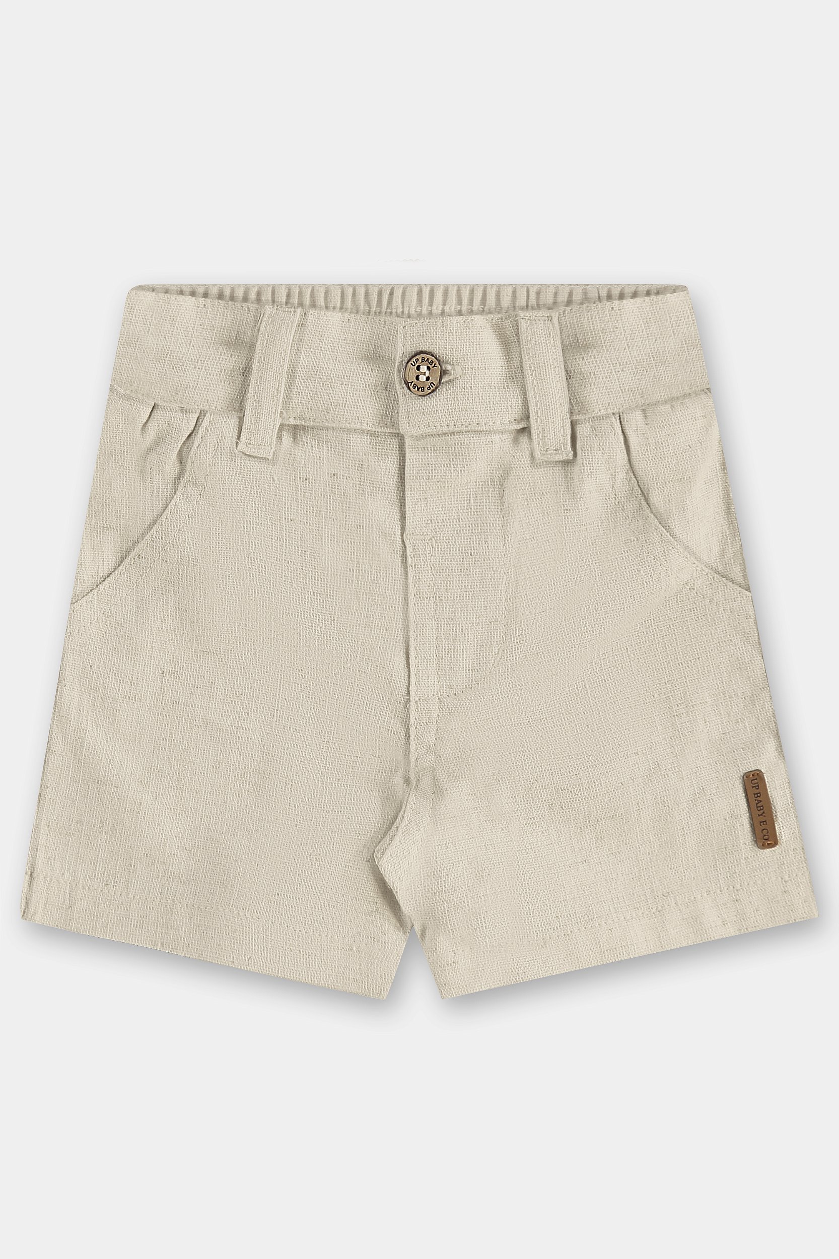 Bermuda para bebê menino confeccionada em tecido de linho misto com elastano e viscose, oferecendo leveza, toque agradável e flexibilidade para acompanhar os movimentos dos pequenos.
