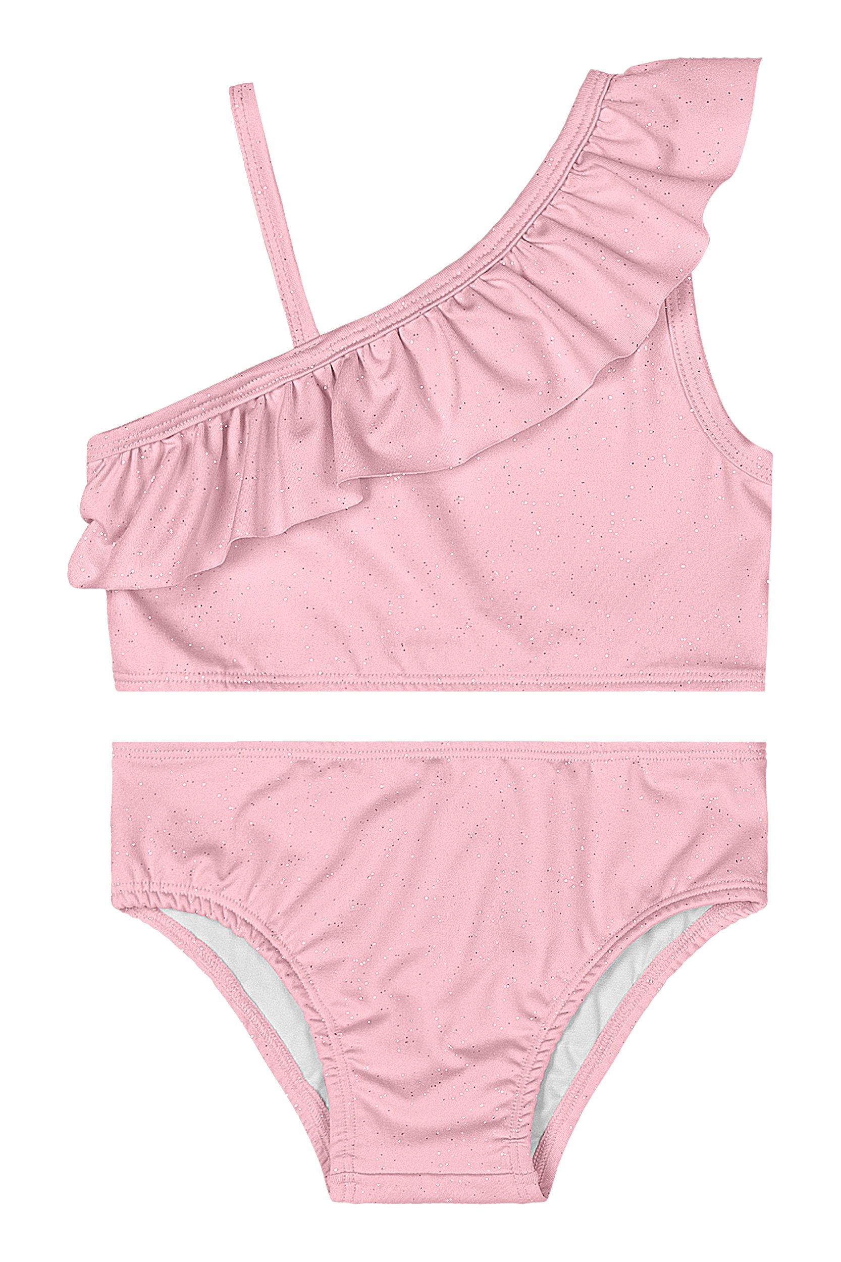 Conjunto biquíni infantil para menina desenvolvido em malha com glitter e proteção solar FPS 50+, com modelagem diferenciada e detalhes delicados.