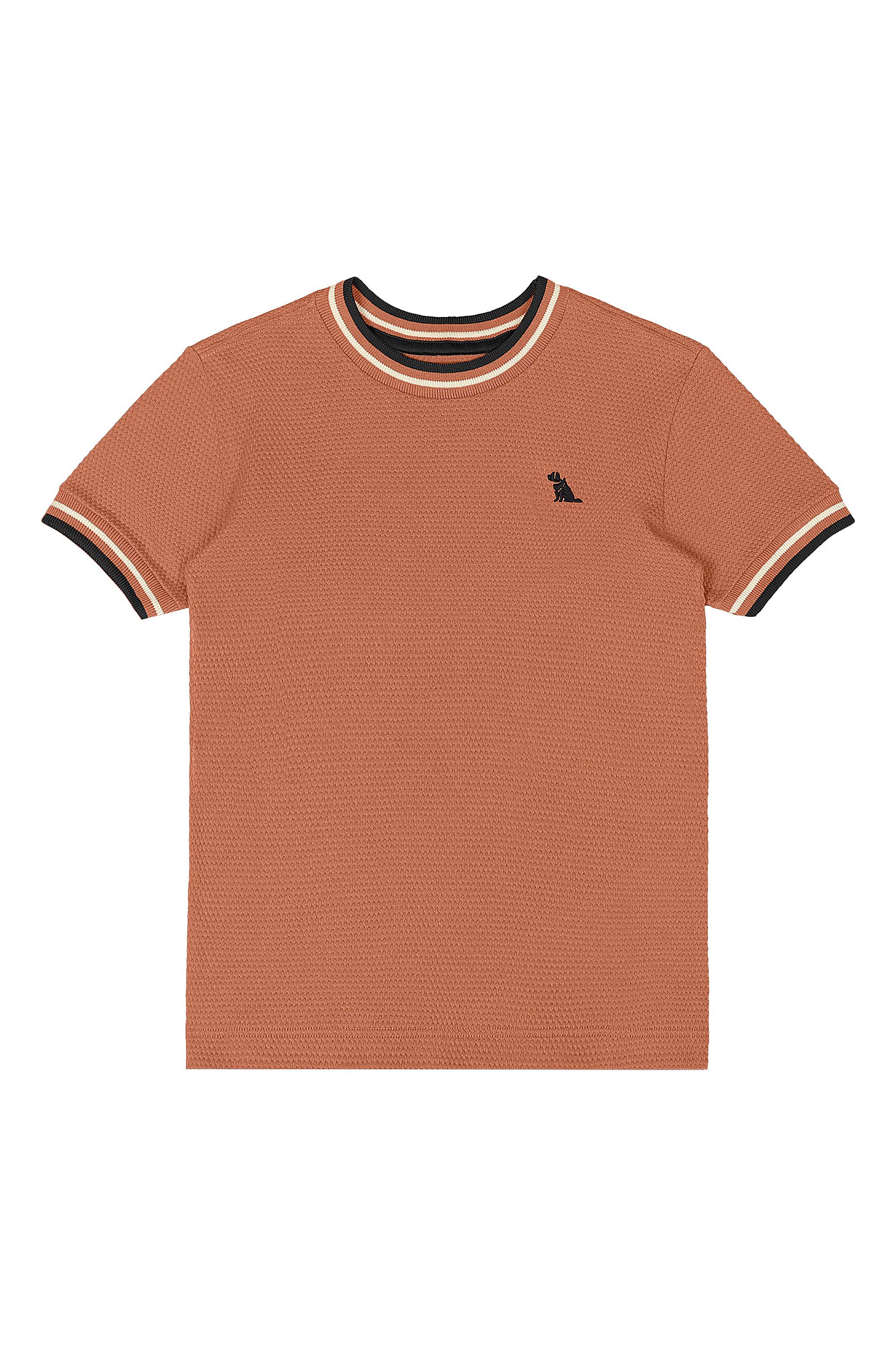 Camiseta infantil masculina confeccionada em meia malha colmeia (algodão), que possui esse nome por lembrar os favos de uma colmeia.