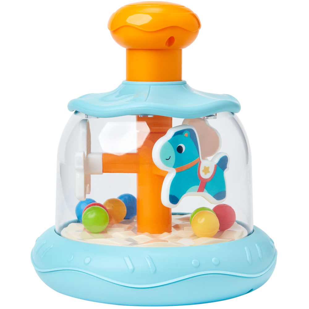 Ao apertar a parte superior, o carrossel gira, movimentando as bolinhas coloridas e encantando o bebê com o efeito visual e sonoro. Um brinquedo que une entretenimento e aprendizado, ideal para acompanhar as descobertas da primeira infância.