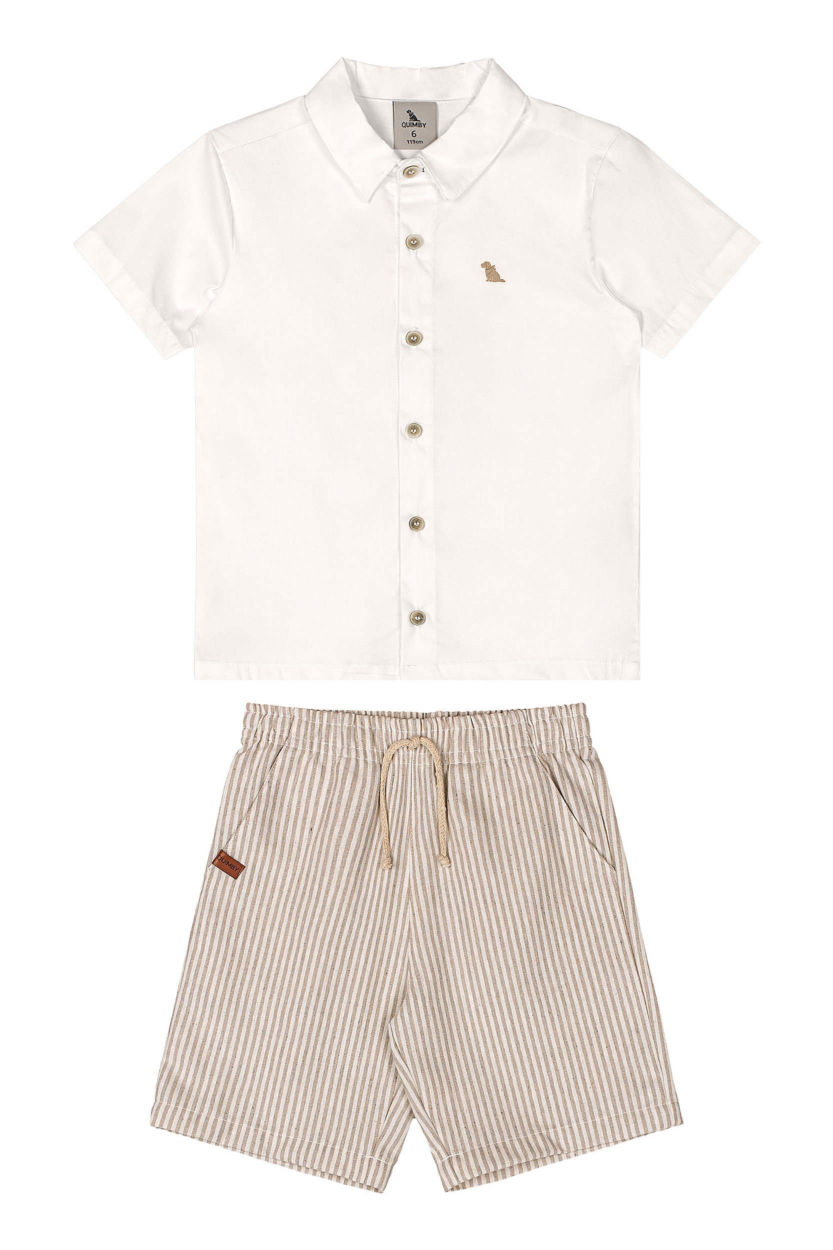 A bermuda em tecido listrado (algodão com poliéster) possui cós largo com elástico, cadarço decorativo e bolsos funcionais, garantindo estilo e liberdade de movimentos. Um conjunto versátil e elegante, perfeito para o verão dos pequenos.