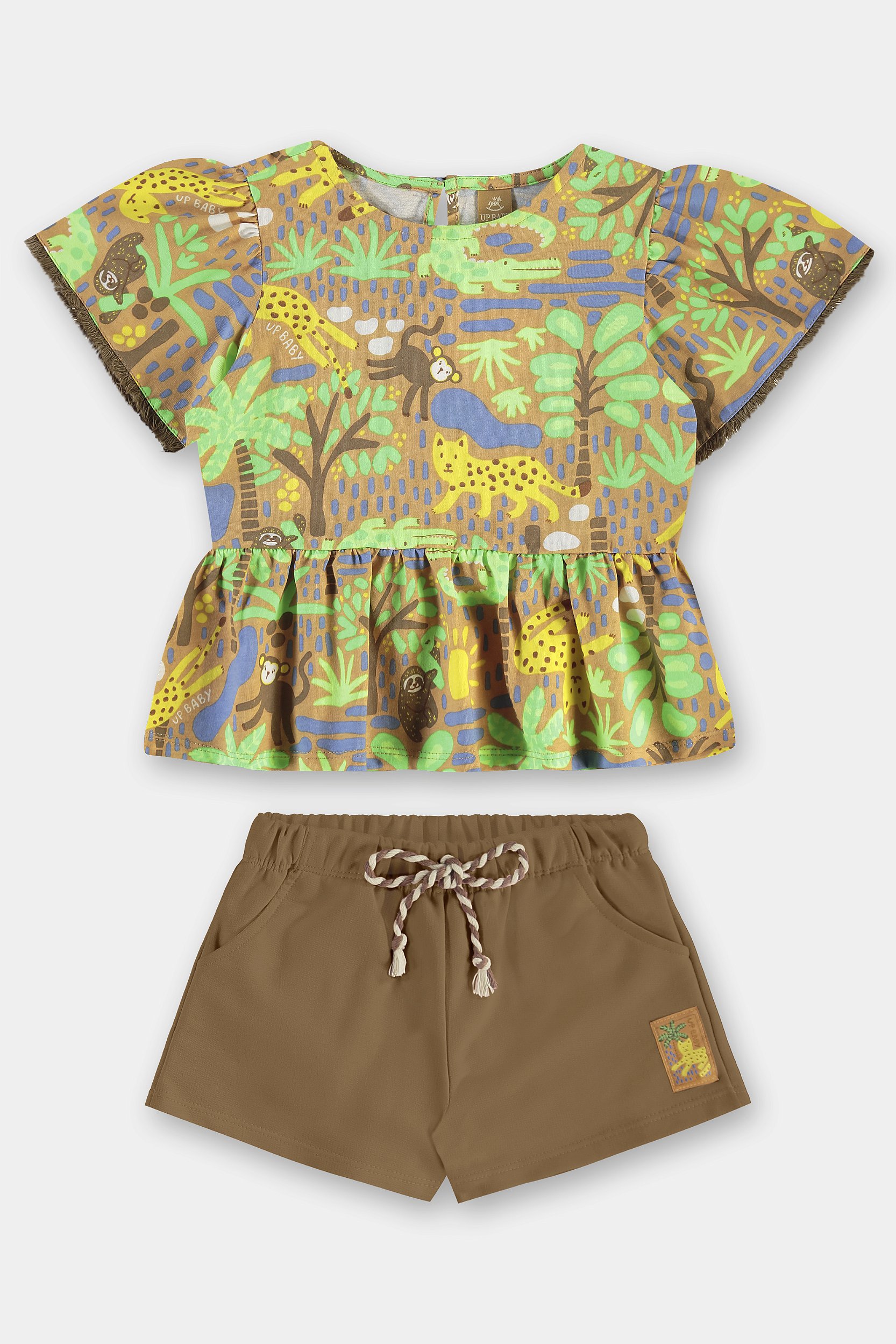 Conjunto infantil para menina, composto por bata e short confeccionados em meia malha (algodão). A bata possui mangas franzidas com detalhe, decote redondo e uma costura na cintura, garantindo caimento leve e gracioso.