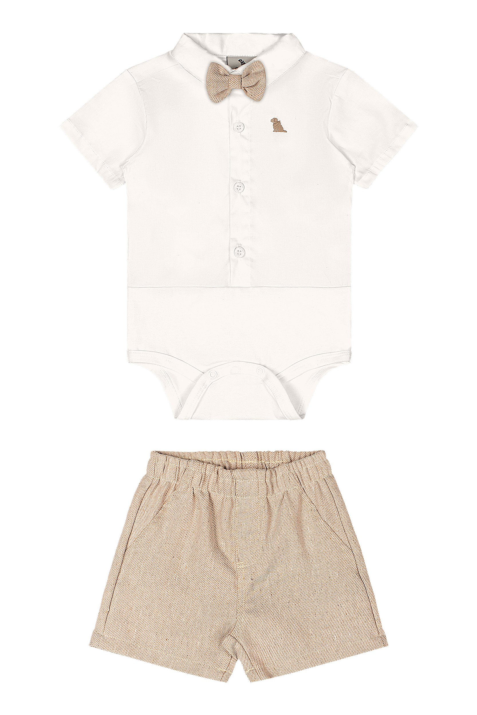 Este conjunto de festa para bebê menino combina estilo refinado e praticidade. O body em tricoline (Algodão com elastano) leve proporciona liberdade de movimento e toque suave.