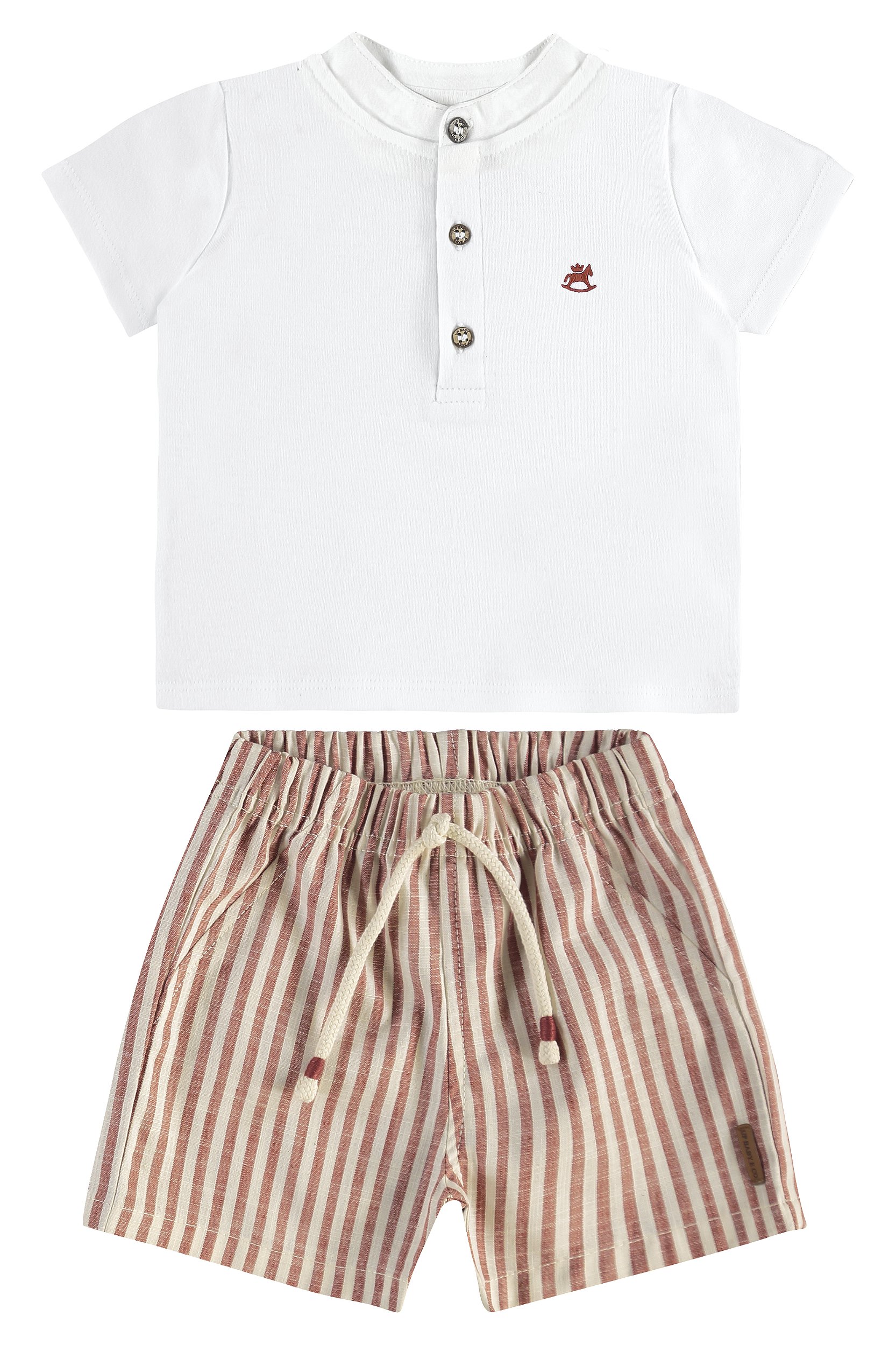 Ideal para os dias quentes, este conjunto para bebê menino une praticidade e estilo. A camiseta se destaca pelo bordado decorativo no peito e pelo peitilho funcional com botões, que facilitam o vestir.