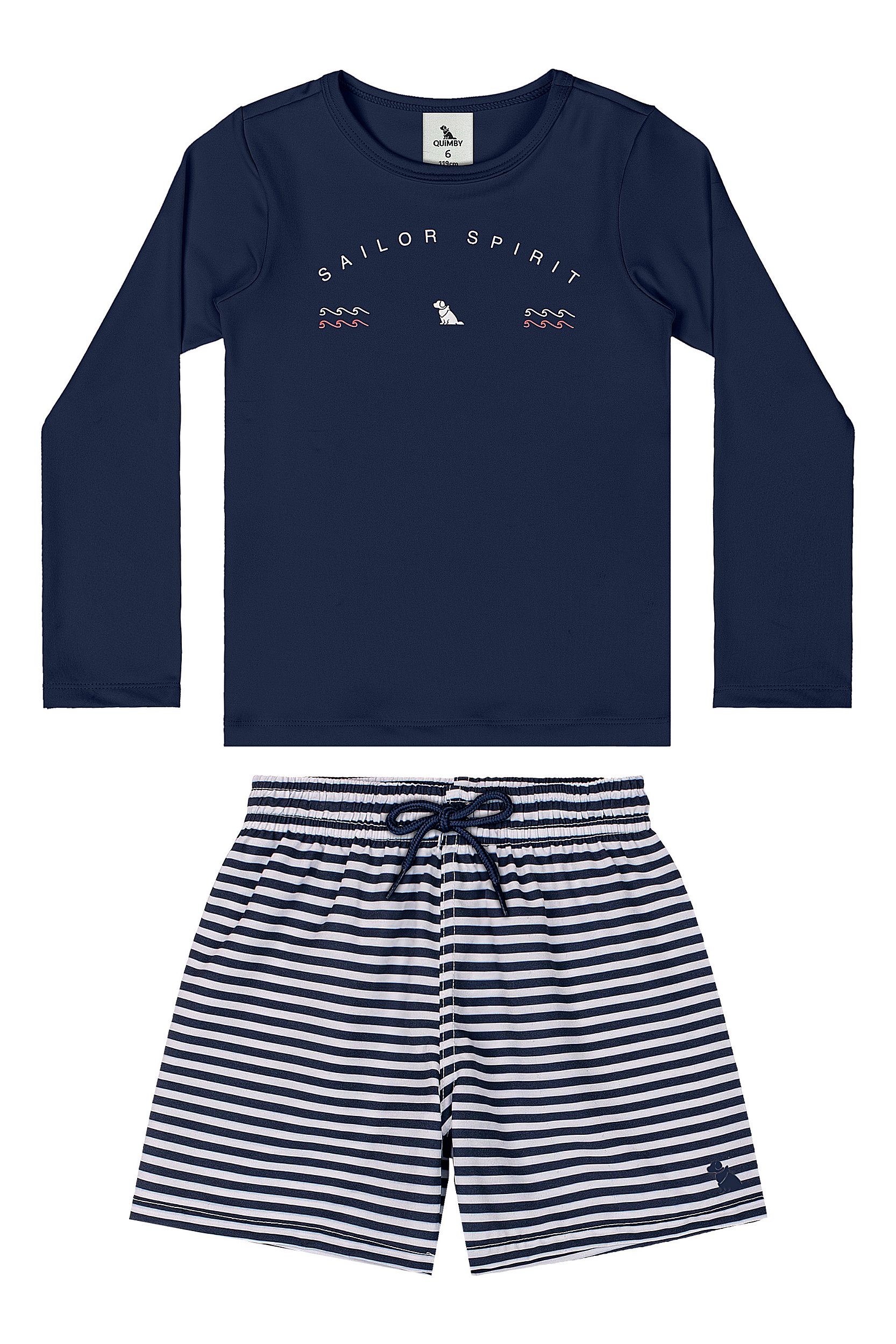 Conjunto infantil para menino, composto por uma camiseta com proteção solar FPS +50 e uma bermuda super leve.