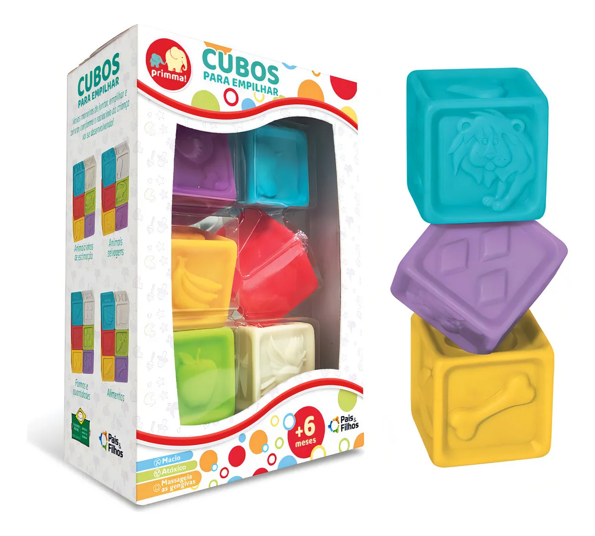 Com 6 bloquinhos macios, de cores variadas e temas diferentes, o bebê pode conhecer figuras de animais, frutas e formas de maneira lúdica e natural, brincando.