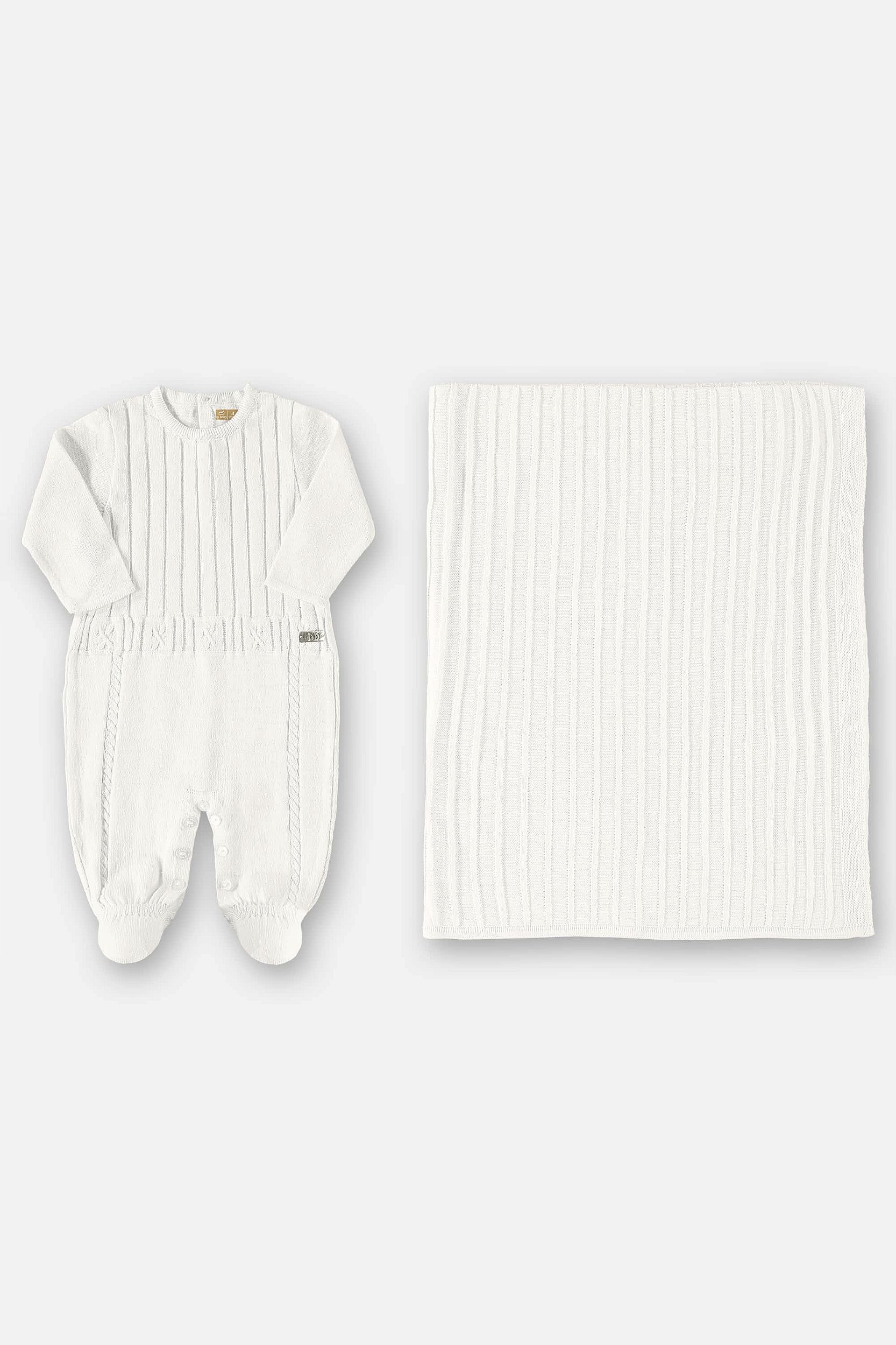 Composto por um macacão e uma manta produzidos em tricot na cor off white, este conjunto é extremamente confortável e macio, garantindo o bem-estar do seu pequeno desde o primeiro momento. O macacão possui pezinho, o que garante a proteção dos pés do seu bebê e mantém seu corpo sempre aquecido. Com abertura com botões e caseados nas costas e entrepernas, este macacão é extremamente prático e fácil de vestir. A manta em tricot é perfeita para envolver o seu bebê com muito amor e aconchego.