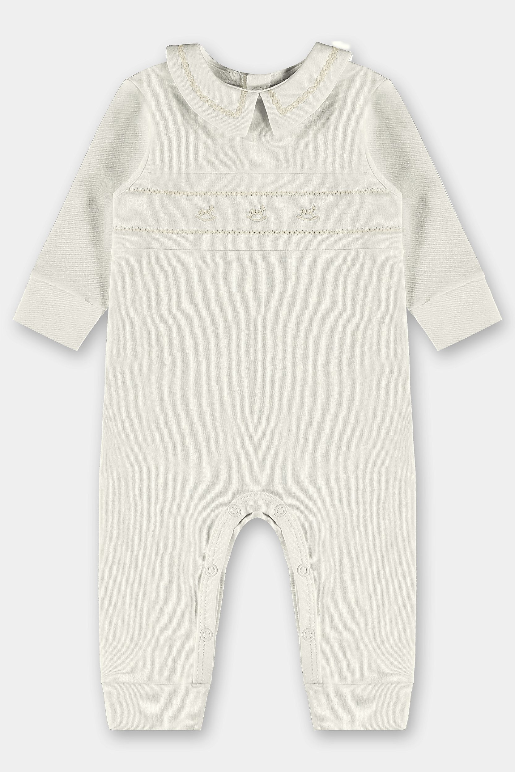Macacão saída maternidade unissex para bebê, confeccionado em suedine de fio Pima, um algodão superior em maciez e resistência, ideal para a pele delicada.