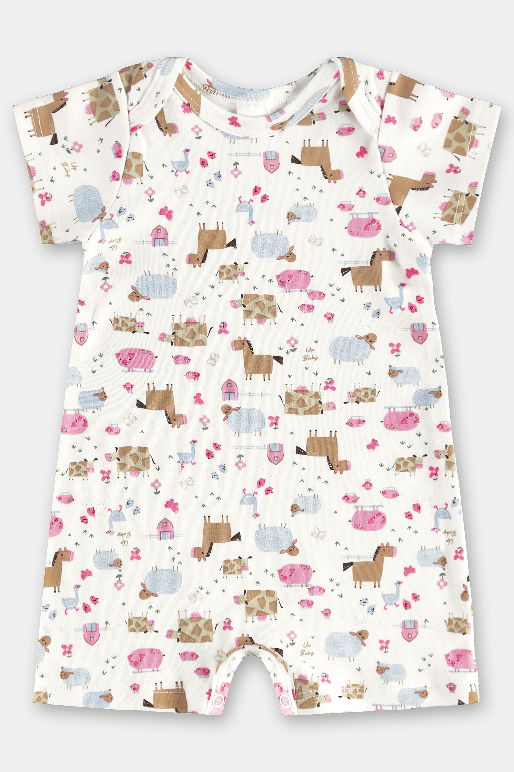 Charmoso e confortável, o macaquinho bebê menina em suedine (algodão) vem com estampa abstrata delicada em tons suaves, perfeita para looks leves e fresquinhos.