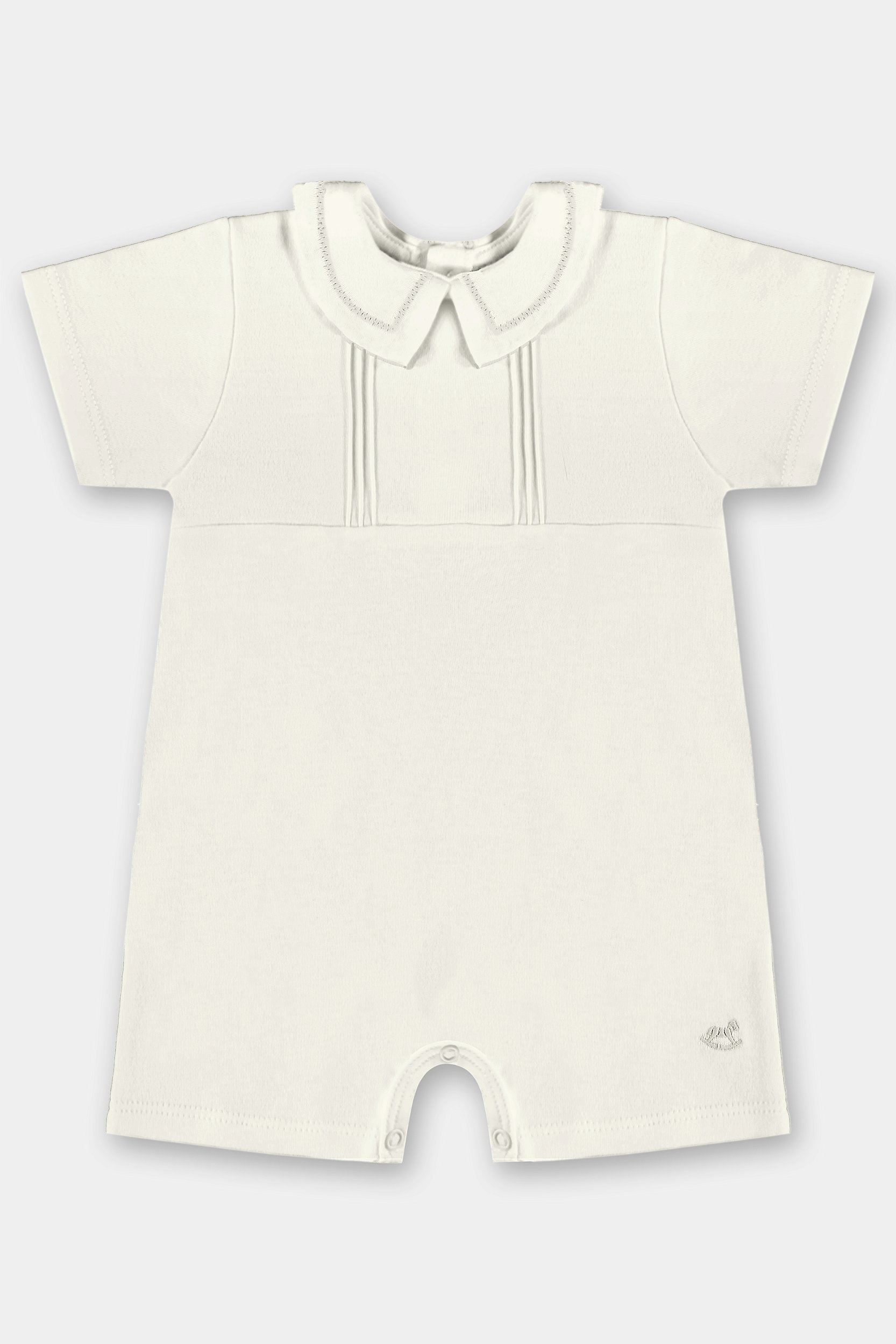 Macaquinho saída maternidade unissex para bebê, confeccionado em suedine de fio Pima Peruano, um algodão superior em maciez e resistência. O design sofisticado inclui gola com nervuras bordadas, ícone da marca também bordado e um recorte na altura do peito. Pensado para a praticidade, possui dupla abertura com botões de pressão, nas costas e entrepernas, facilitando as trocas. Seu tecido premium garante conforto extremo e toque suave na pele delicada do bebê, sendo um item perfeito para o enxoval e ideal para ocasiões especiais ou para o dia a dia.