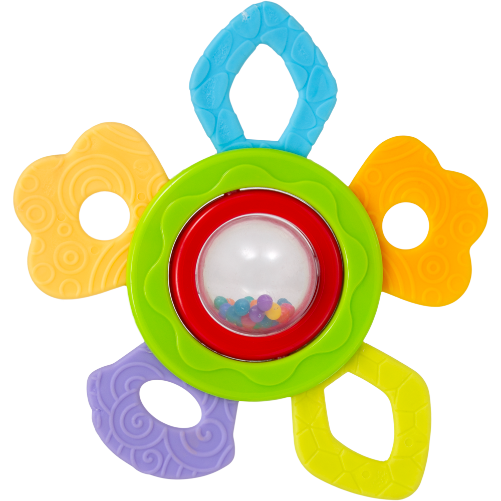 O Chocalho com Mordedor da Buba oferece uma variedade de texturas e cores para o bebê brincar e morder. O centro giratório completa a diversão, emitindo sons a cada movimento.