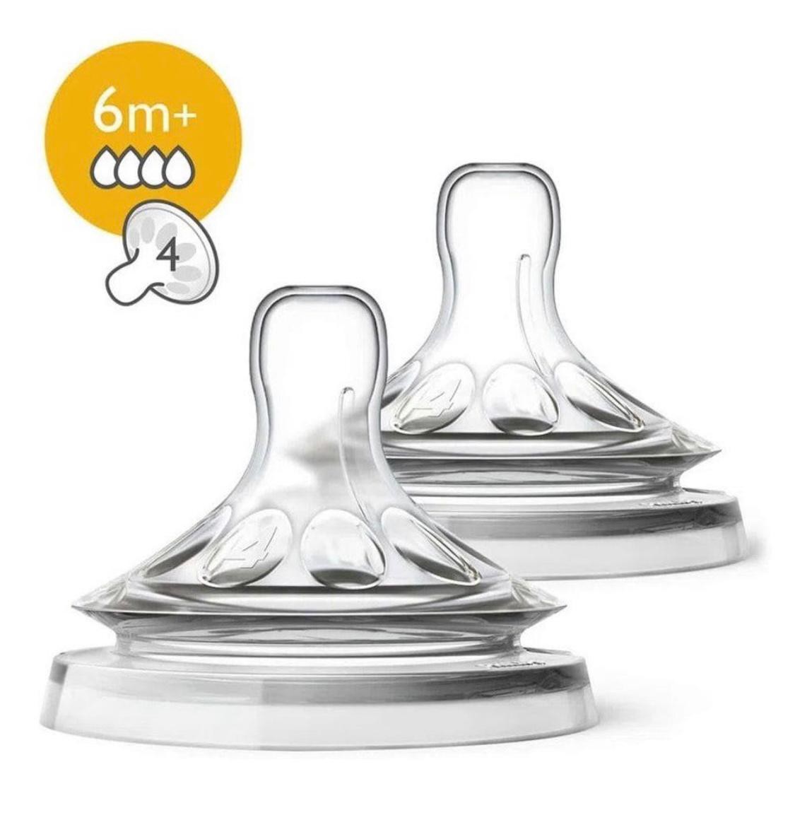 O Kit contém com 2 unidades fase 4 da Avent, é macio, livre de BPA e seu fluxo é médio com 4 orifícios para uso a partir dos 6 meses.