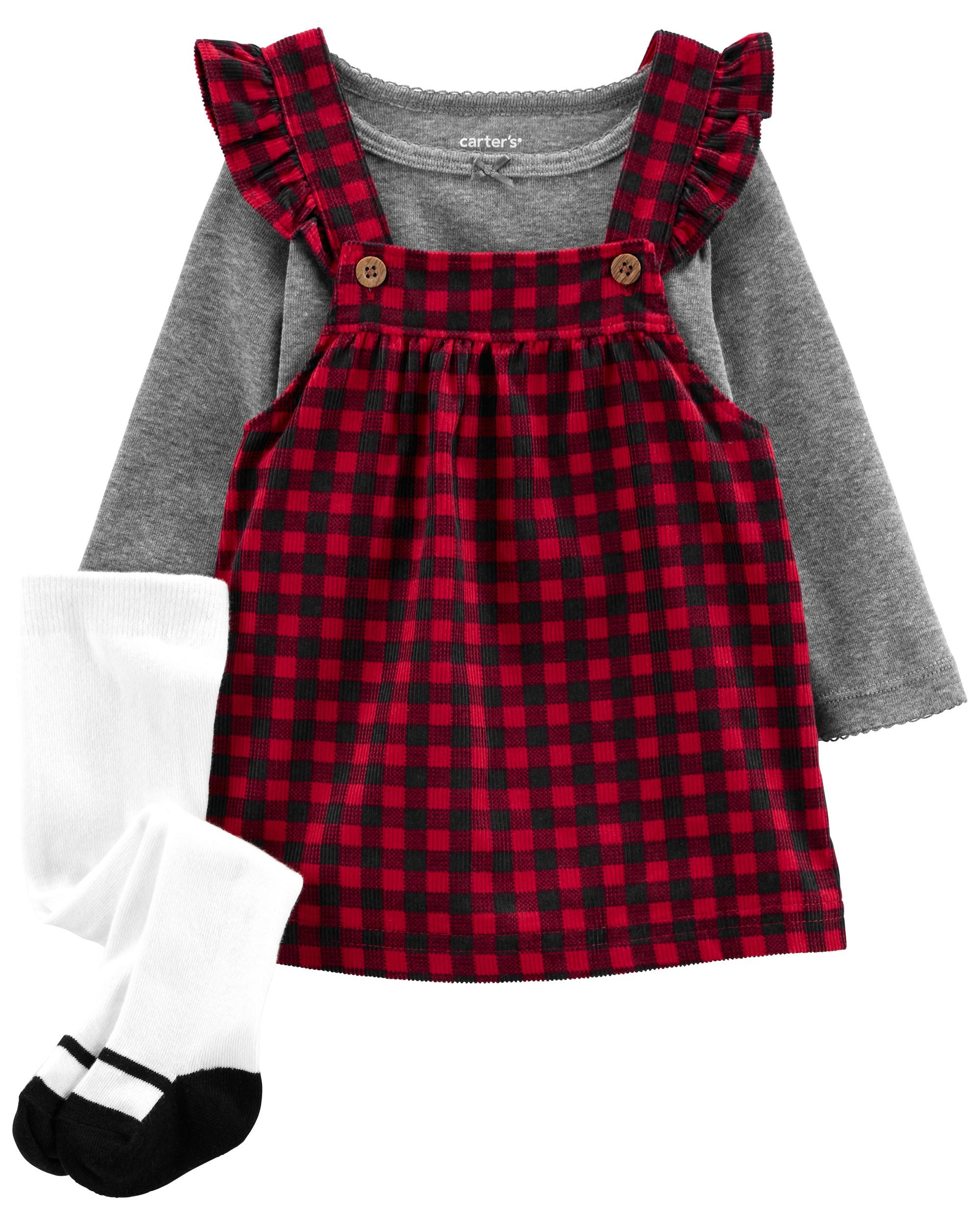 O conjunto é composto por duas peças super delicadas, sendo uma camiseta manga longa cinza e uma linda jardineira com toque aveludado xadrez e acompanha meia calça.