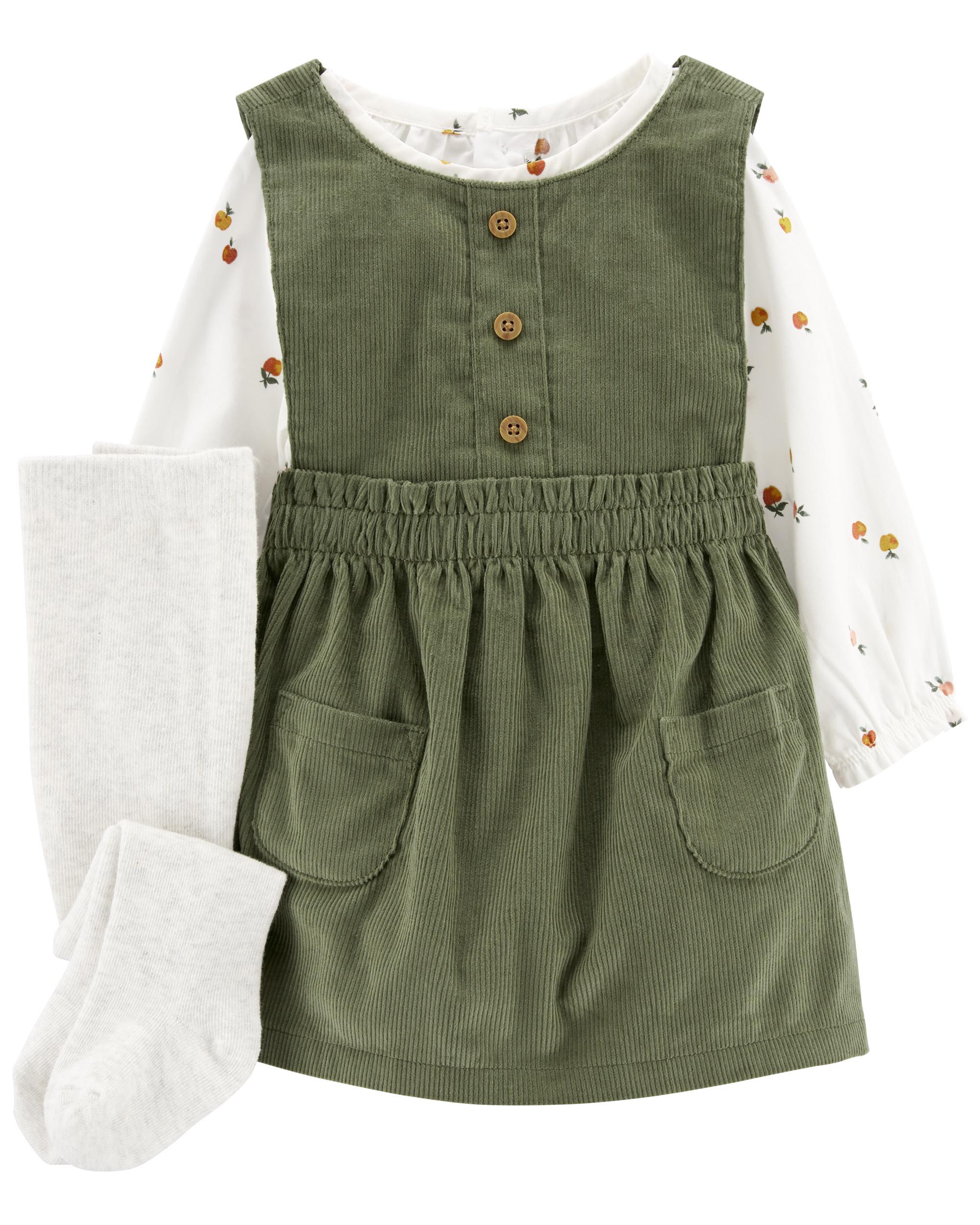 O conjunto é composto por três peças super delicadas, sendo uma camiseta manga longa, uma linda jardineira/vestido com estampa floral e meia.