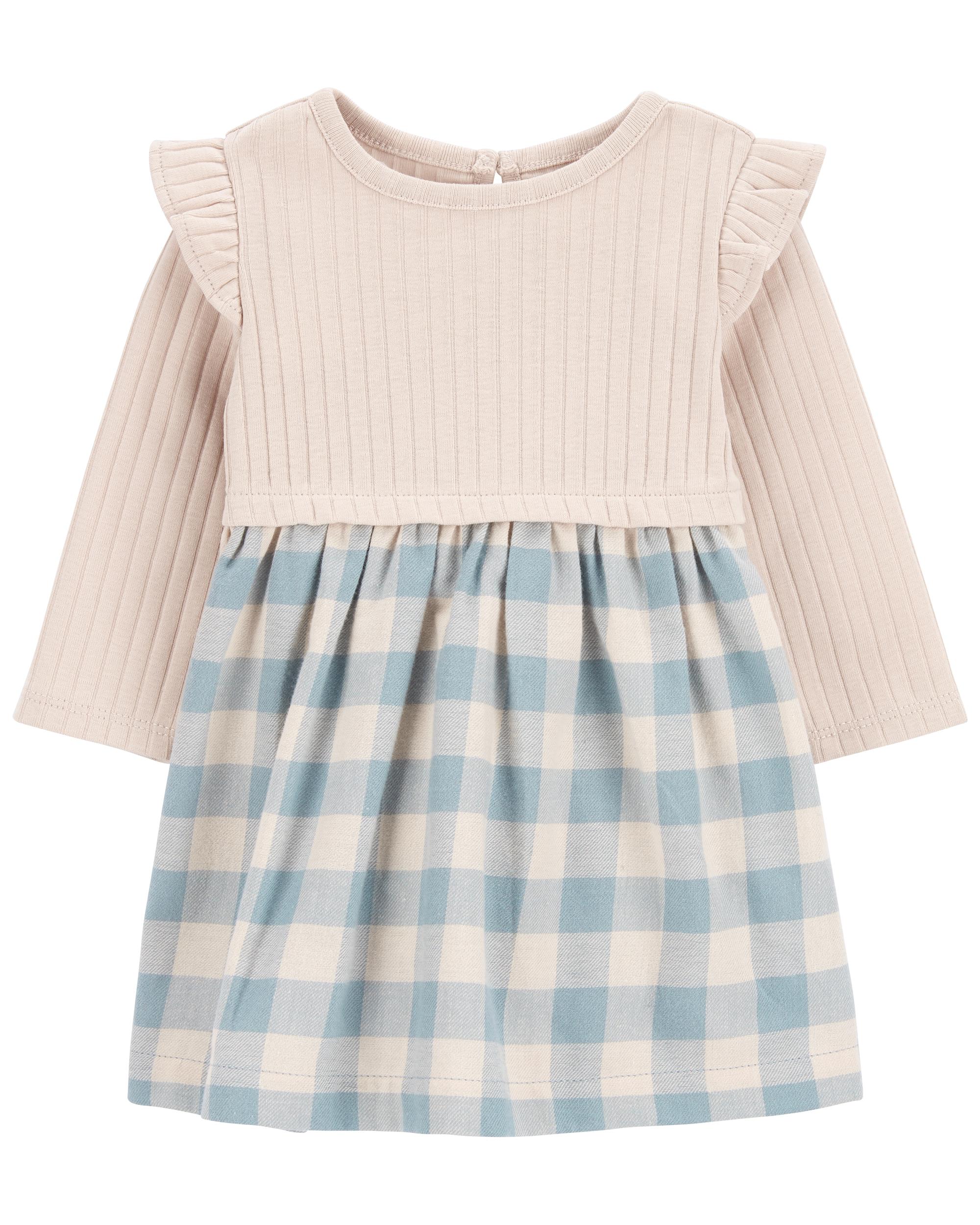 Confeccionado em malha de algodão, com padronagem xadrez mangas longas e detalhe de babado no ombro.