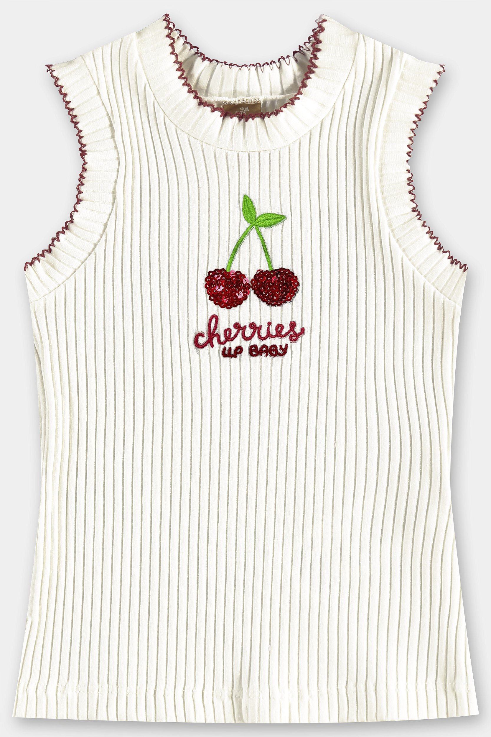 Regata infantil confeccionada em ribana canelada, tecido de algodão com elastano que garante maciez e caimento ajustado ao corpo da pequena.