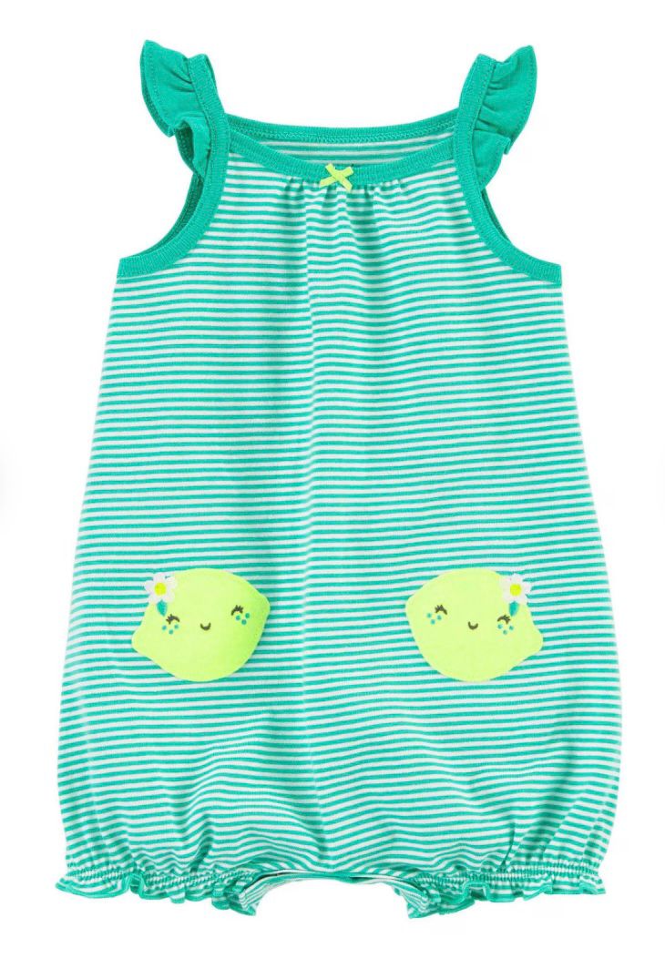 O design com manga alcinha babados, estampa de limão e abotoamento entrepernas. Sua malha de algodão, tem um toque suave e macio para a pele do bebê.